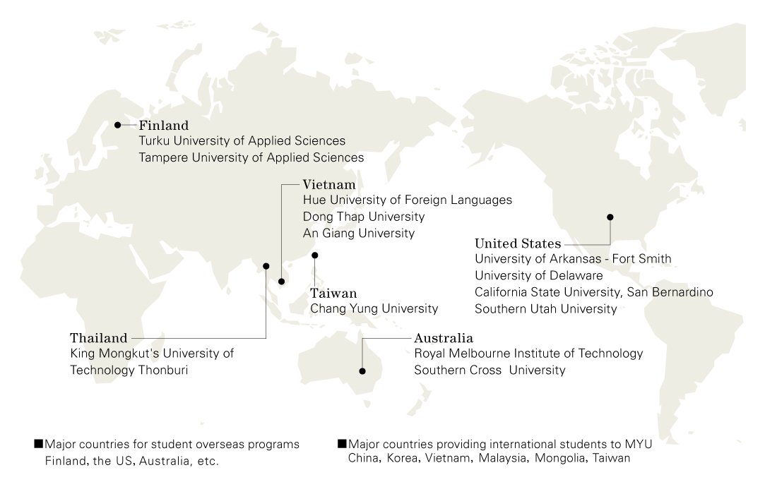 CIEOS designs overseas programs for a variety of students in order to provide the best opportunities for personal growth and academic development. The center also facilitates MYU-faculty members’ efforts to share their research activities overseas and to insure the successful completion of their research projects involving international collaboration.