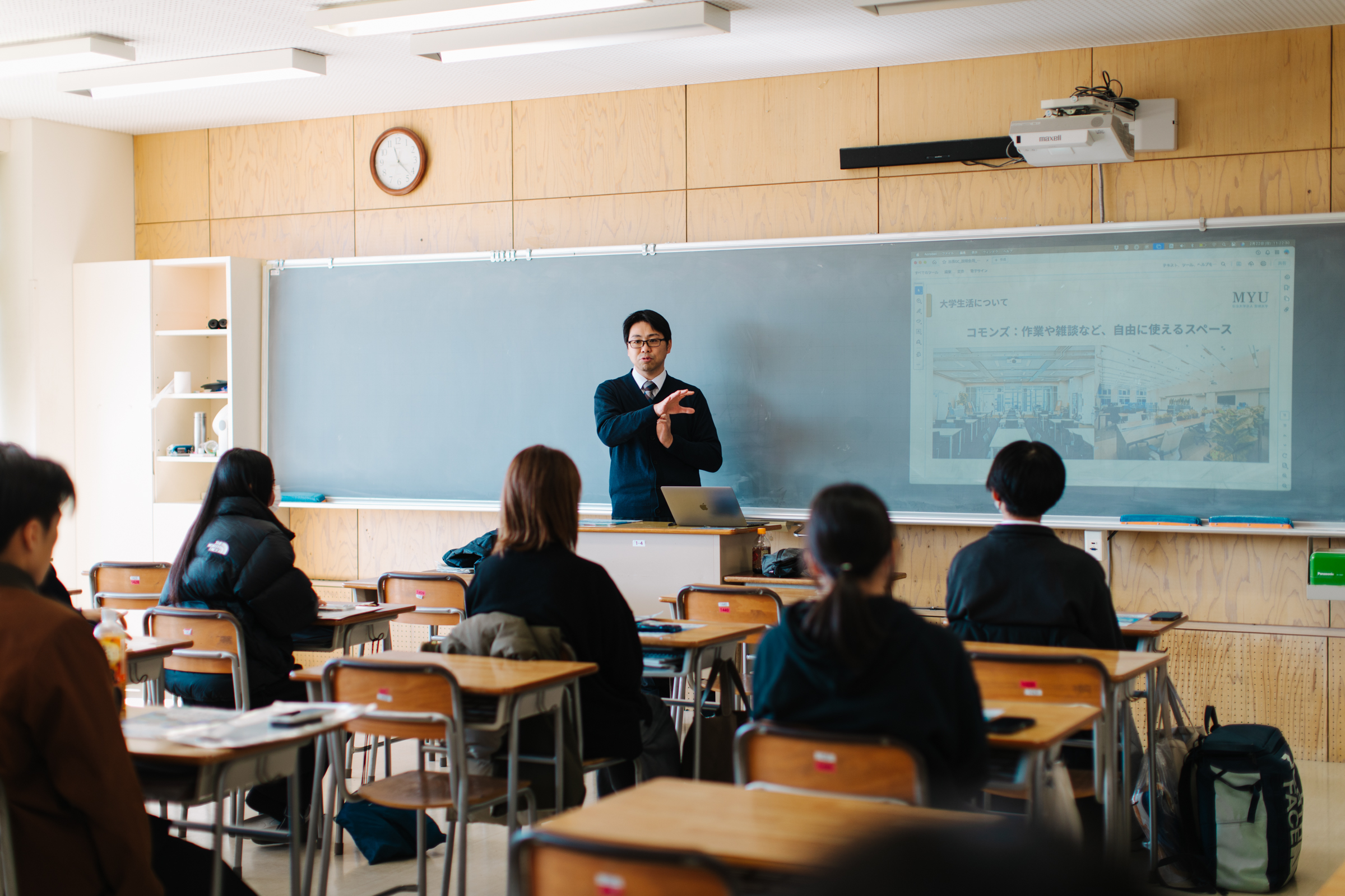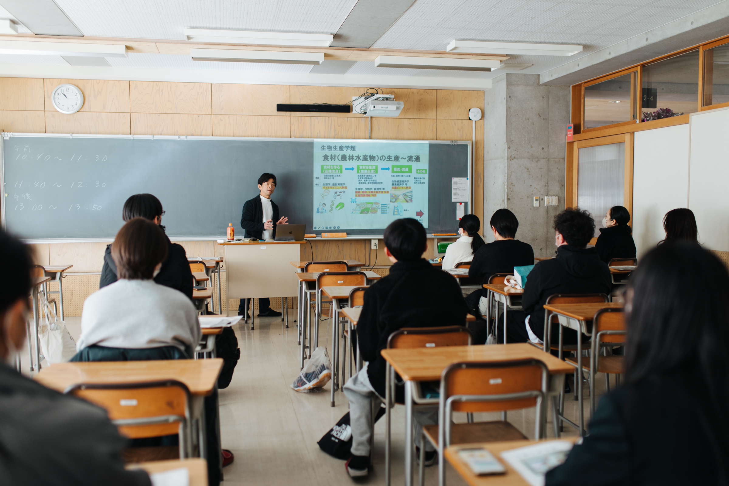 | 09:30~10:30 | 【1限目】 大学ガイダンス | 参加者全体に向けて、宮城大学の概要説明、入試説明、学生によるサークルや学生生活の紹介などを行います。※参加必須 | ||