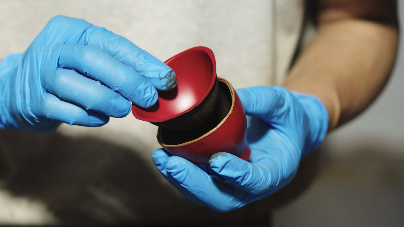 カップの部分には、奈良時代から伝わる漆の技法「乾漆(かんしつ)」が使用されています。漆器や伝統建築、武士の甲冑や華麗な装飾が施された工芸品などに「漆」が広く用いられてきたことは多く知られていますが、「乾漆」は「漆」の硬化する性質を活かした造形技法です。麻布や和紙を漆で固め造形する技法により、複雑な形状でも造形することが可能です。