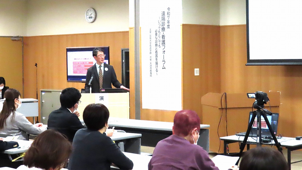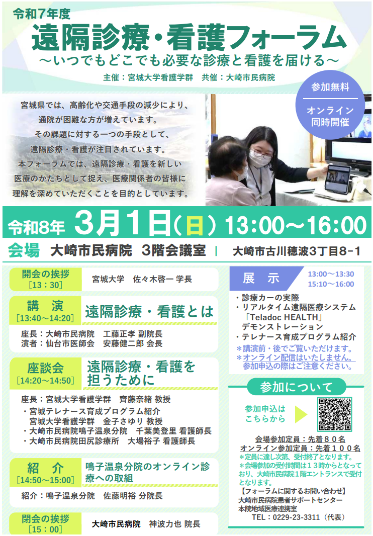高齢化や交通手段の減少により通院が困難な方が増えている宮城県。その課題に対する一方策として、本学が開講している「みやぎテレナース育成プログラム」も5年目を迎えます。当初は本学の教職員を中心に展開していましたが、徐々に協力の輪が広がり、2026年3月1日には大崎市民病院の皆様と「遠隔診療・看護フォーラム」を共同開催いたしました。