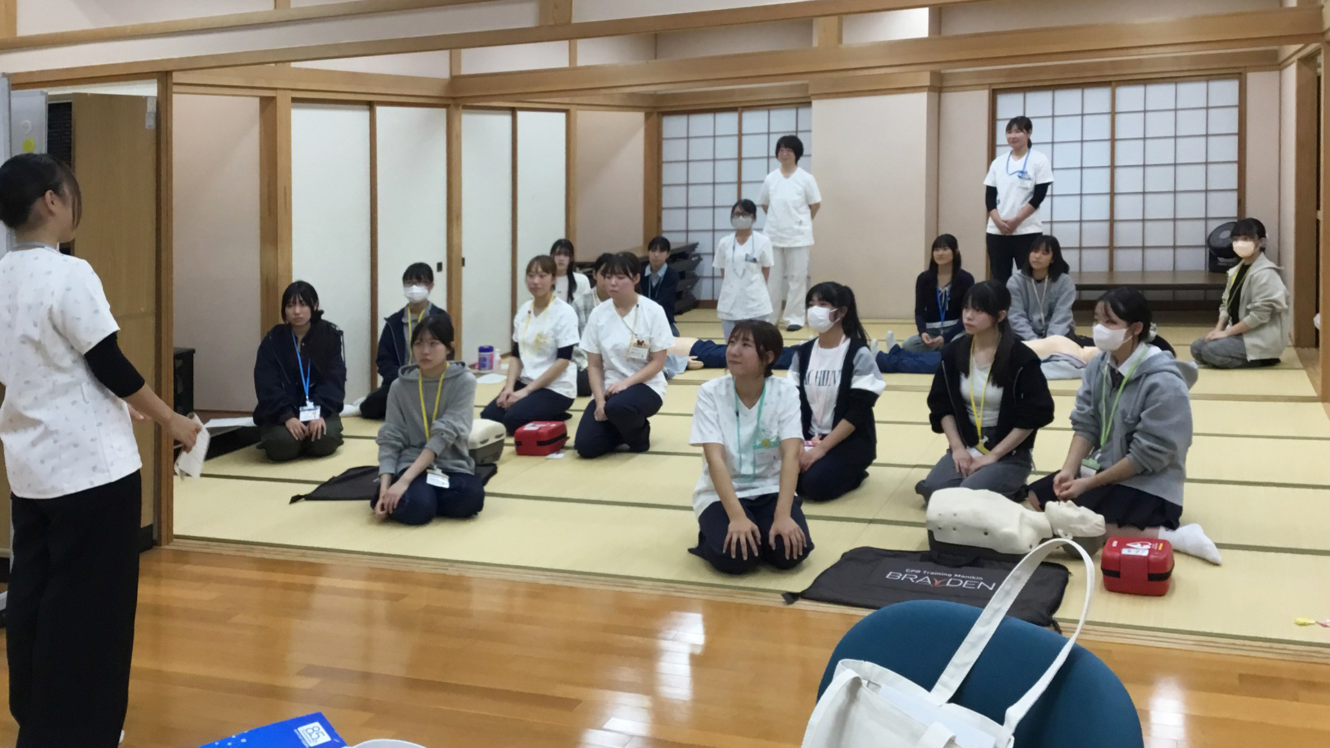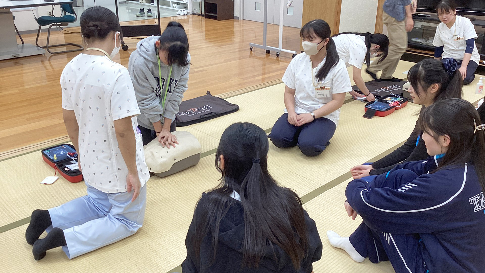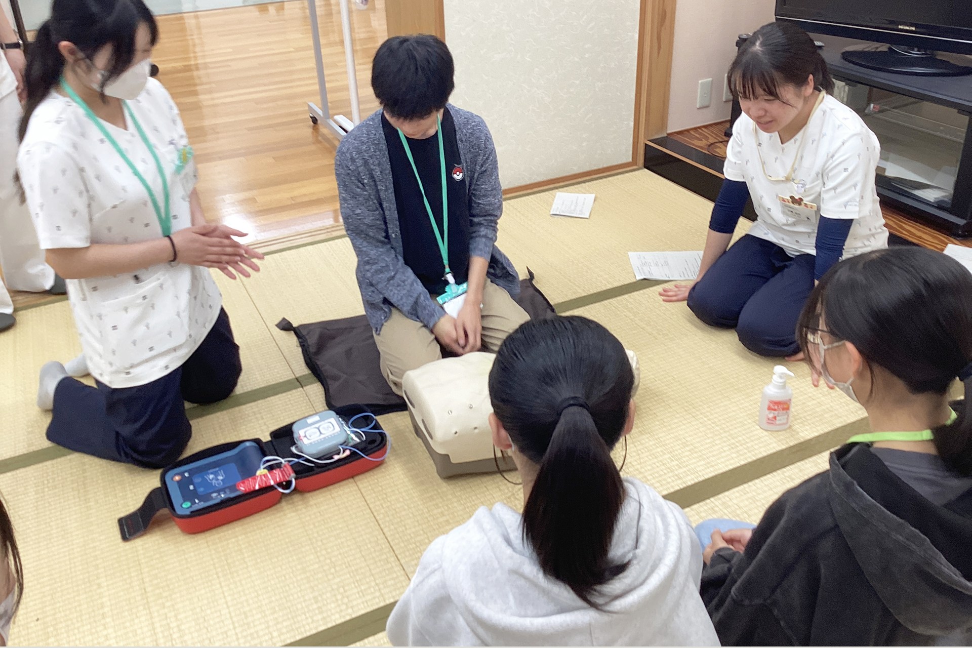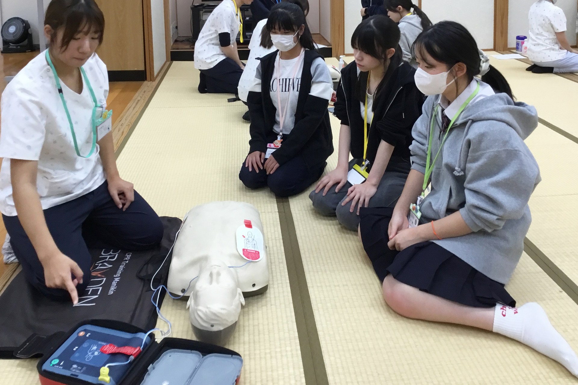 続いて、ナーシングラボに移動し、みやぎプレナーススクールアンバサダーが中心となり一時救命の基礎知識をわかりやすく説明しました。その後、心肺蘇生法とAEDを使用した実技を体験しました。