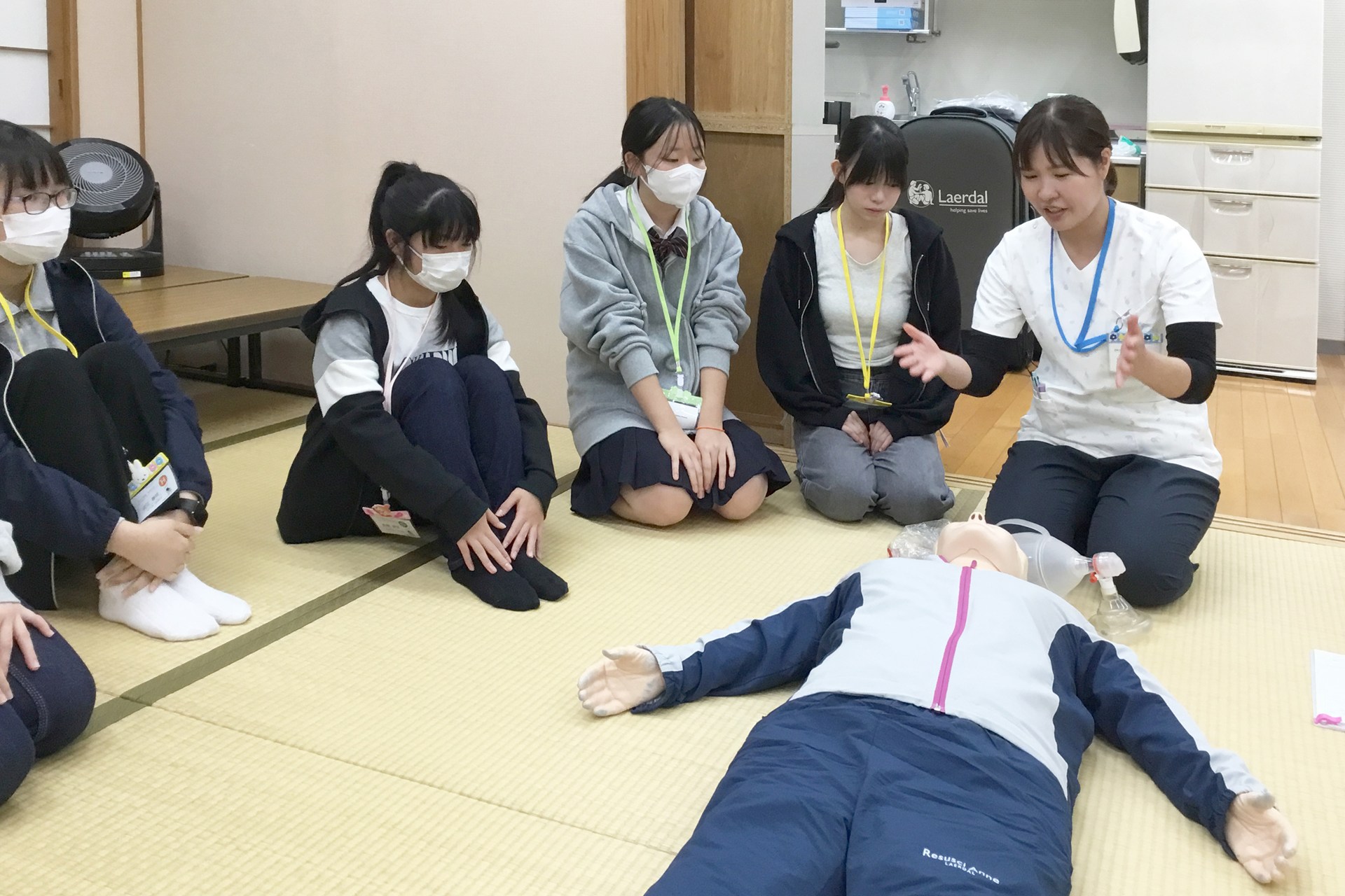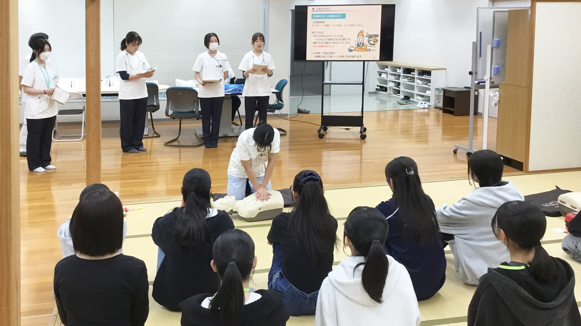 宮城県・宮城大学連携事業「みやぎプレナーススクール」は、未来の看護職を目指す中学生・高校生を対象に、宮城大学が看護体験や看護学生と交流するプログラムを提供するプログラムであり、2025年度7月~2月にかけて4回開催する予定です。10月12日、「みやぎプレナーススクール」第3回となる宮城大学大学祭「看護学生と他学群学生の交流紹介、アンバサダー企画:AEDを使用した一時救命の実技体験」を実施しました。