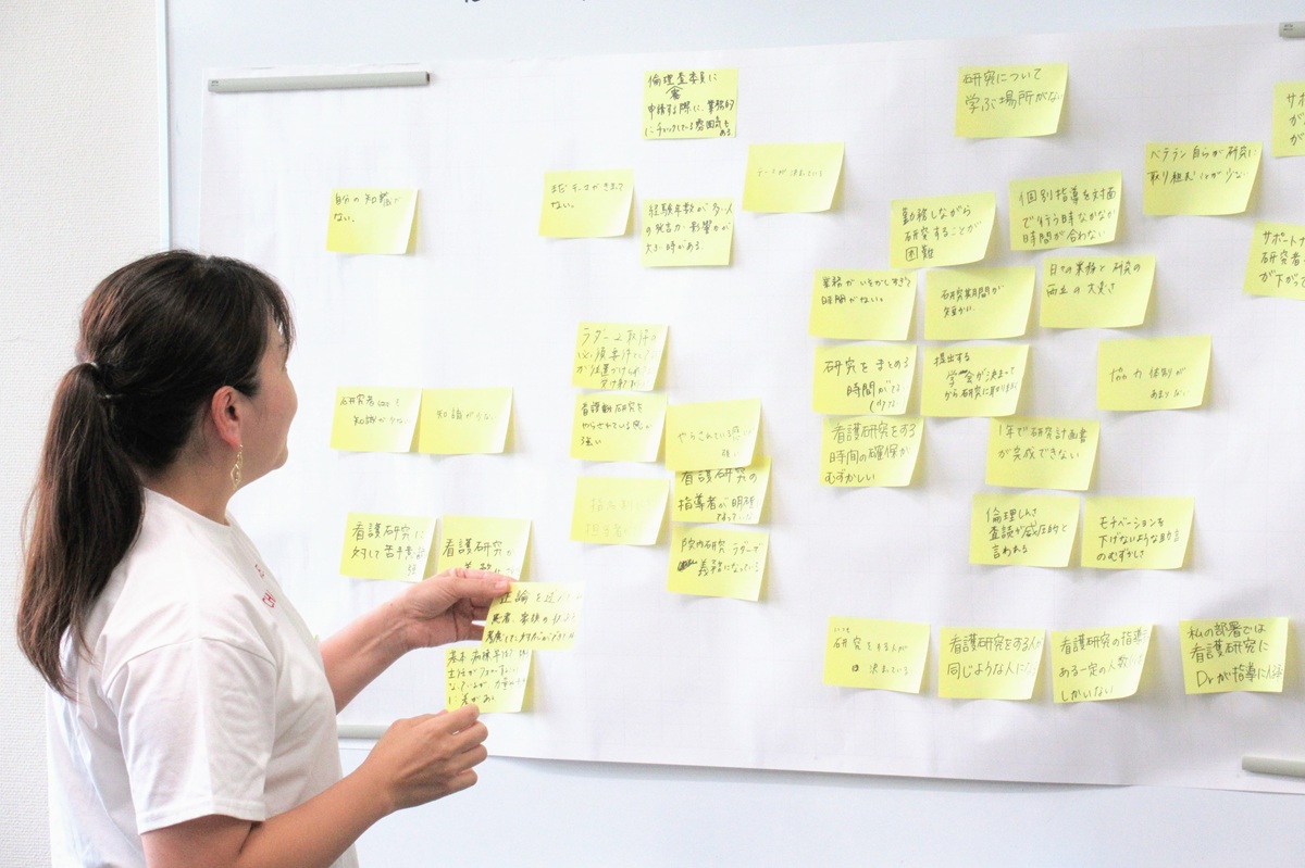 臨床看護研究を進めるにあたって必要となる基礎的知識の定着を図るとともに、施設内での研究指導において困難に感じていることを受講者同士で共有することにより、問題解決を促進するヒントを得ることができます。各回とも、グループワークにはファシリテーターとして教員が参加・助言を行い、個別相談の時間も設けます。