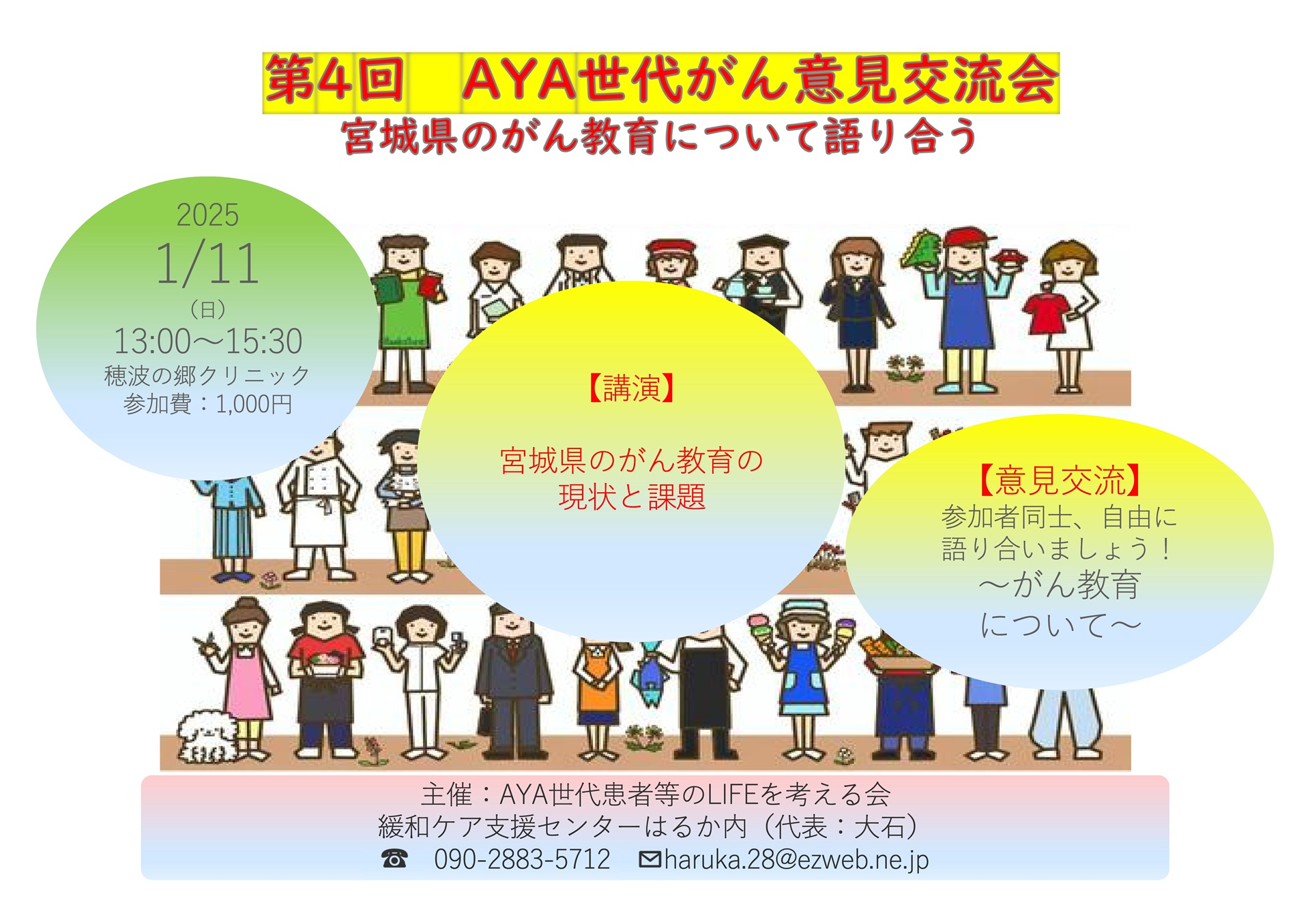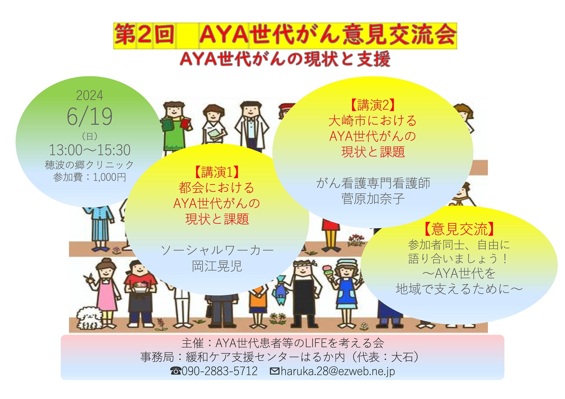 また、AYA世代(15歳~30歳代)のがん患者さんが、住み慣れた地域の中で安心して生活・治療・学習・就業等が出来ることや、それらを気軽に相談できる環境づくりにも取り組んでいます。AYA世代がん患者支援として開催している交流会には、地域住民の方や学校関係者、医療関係者が参加し、活発な意見交換が行われています。