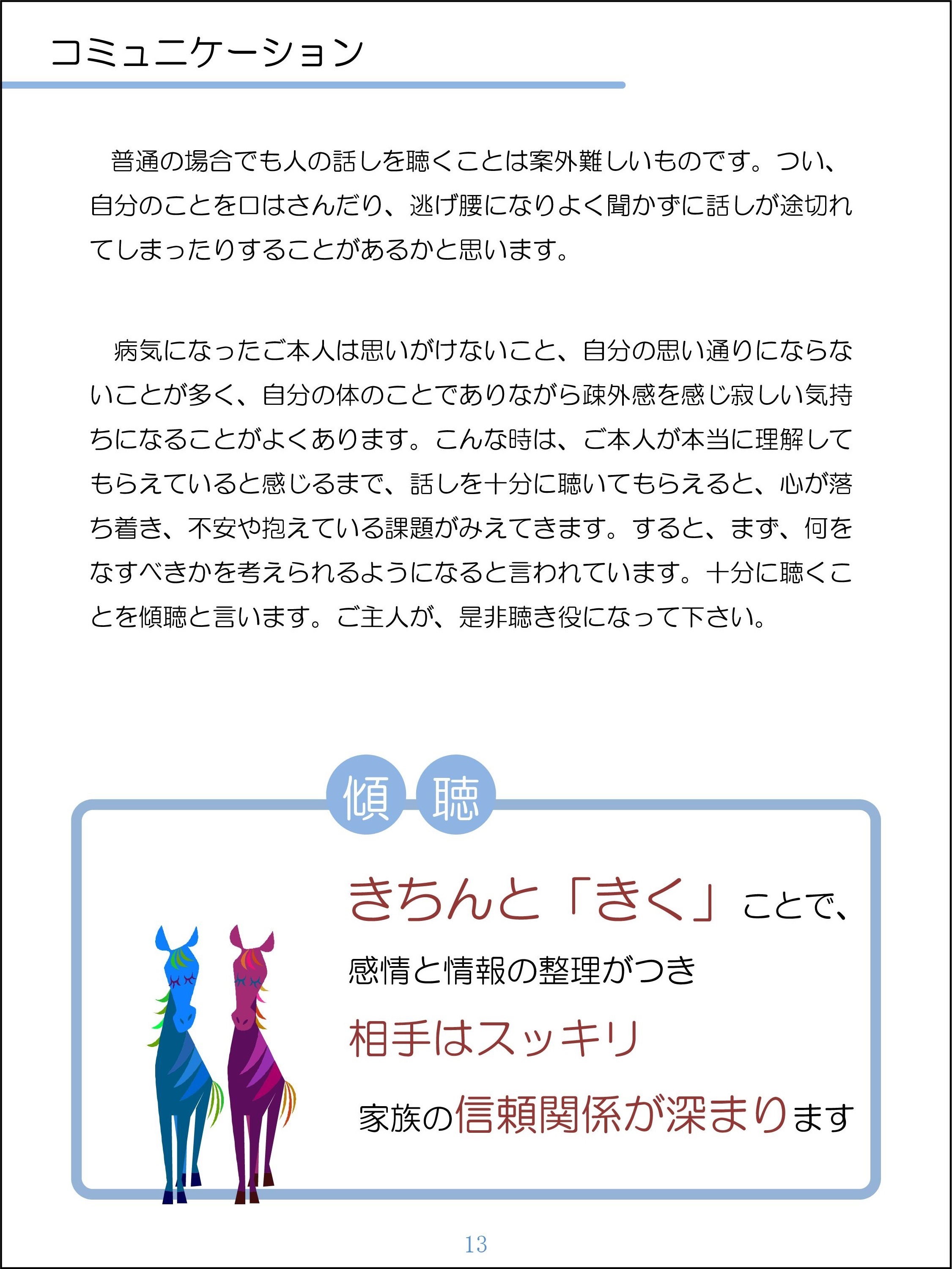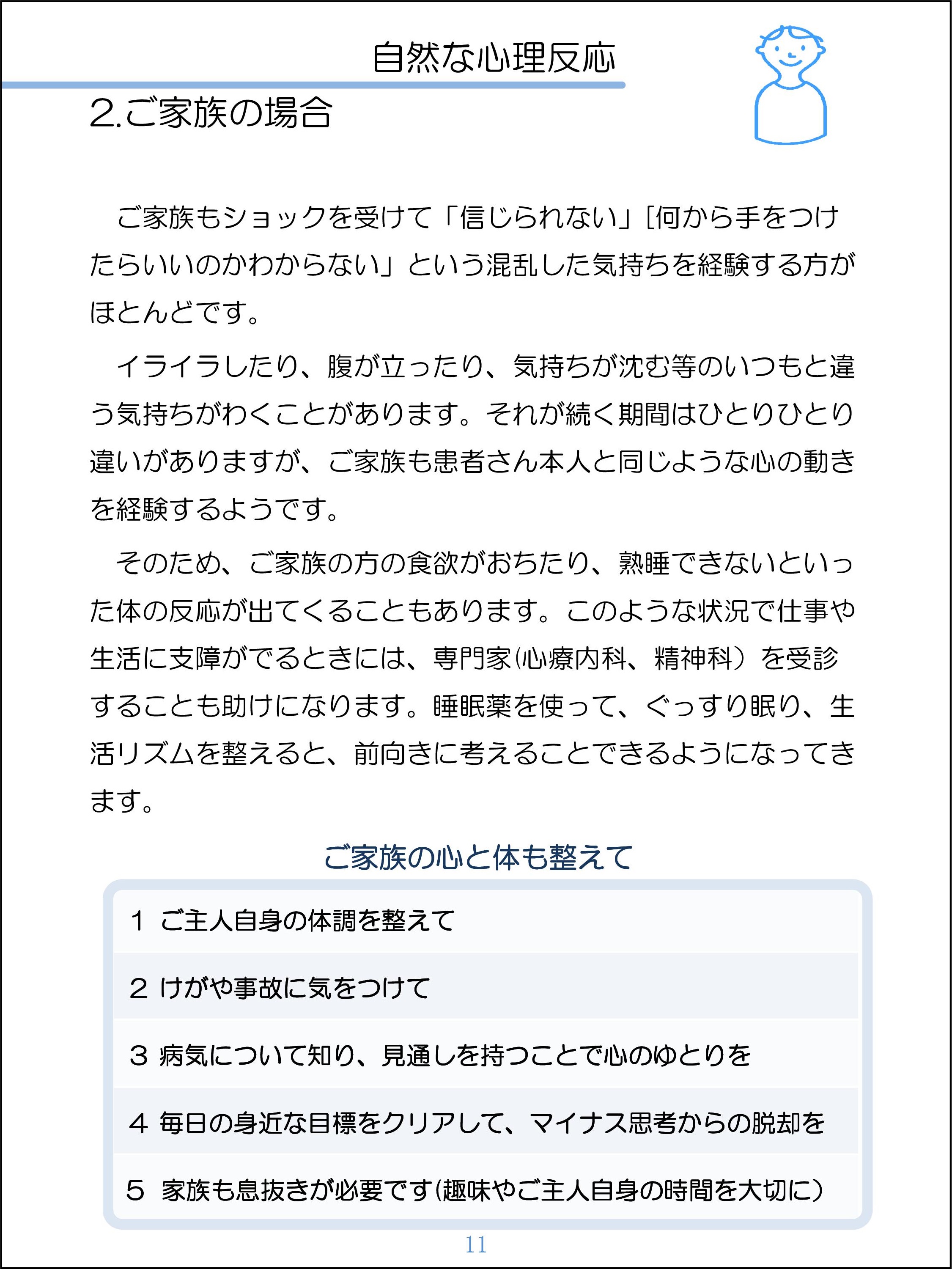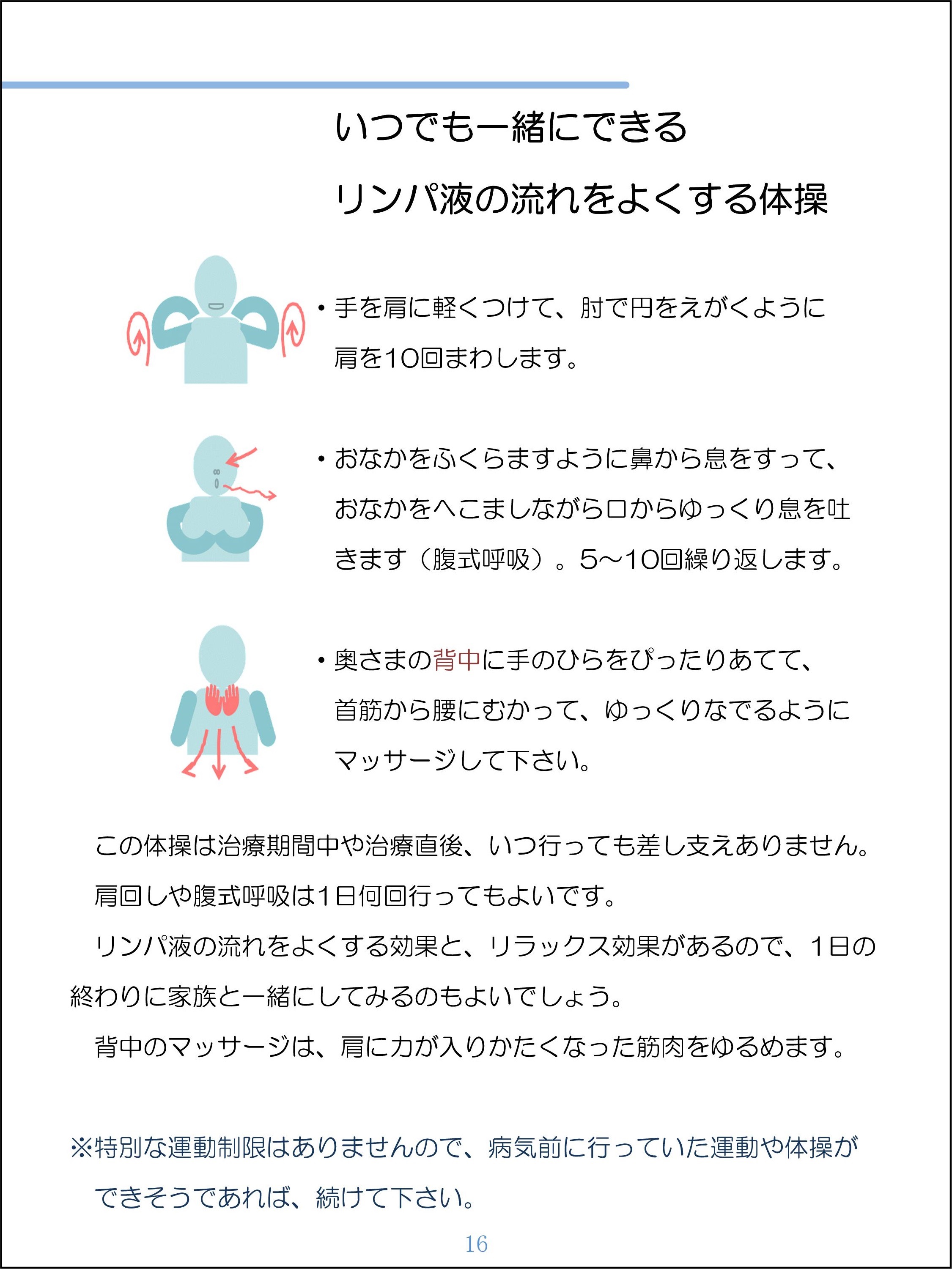現代では多くの方が、がんを経験します。治療の進歩により延命できるようになってきていますが、治療の副作用の負担、数年に渡り治療が続くことによる負担は大きくなっています。がんにかかったことでの気持ちの落ち込みをやわらげ、治療に向かう気持ちを支えるための援助に関する研究に取り組んでいます。がん患者さんの支えの一つが家族です。家族が、がん患者の治療を支え、生活を維持するためには、聴くこと、話すこと、気持ちを分かち合うことが大切です。乳がん患者の家族のためのパンフレットでは、がんにかかった時の自然な気持ちの揺れを知ることや、気持ちを分かち合う必要性、わかちあいの手段の一つとして、リンパ浮腫予防のケアを兼ねた簡単な体操を紹介しています。