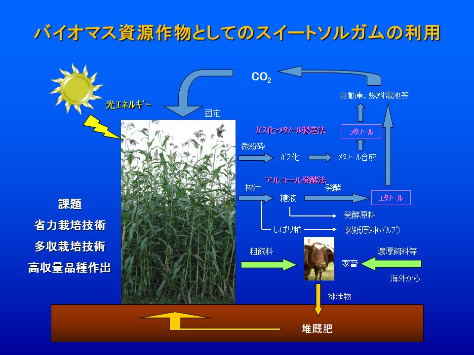 1970年代のオイルショック後、バイオマス作物として取り上げられましたが、最近再び注目されています。搾汁した糖液からエタノールを生産し(バイオエタノール)、自動車の燃料として活用できますし、さらには地上部全体をガス化・メタノール製造法によってより効率的にエネルギー変換できる技術も開発されています。